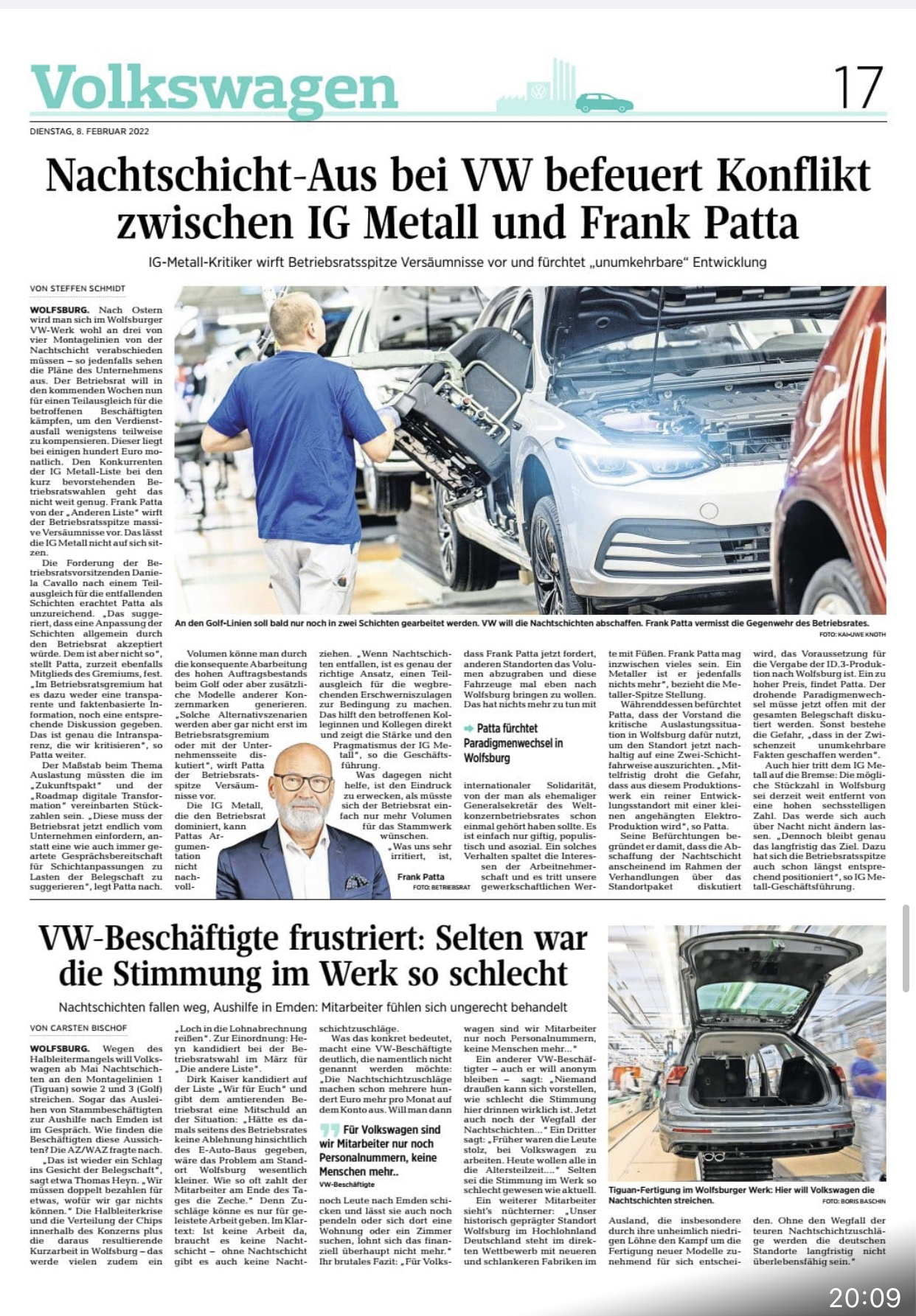 Nachtschicht-Aus bei VW befeuert Konflikt zwischen IG Metall und Frank Patta